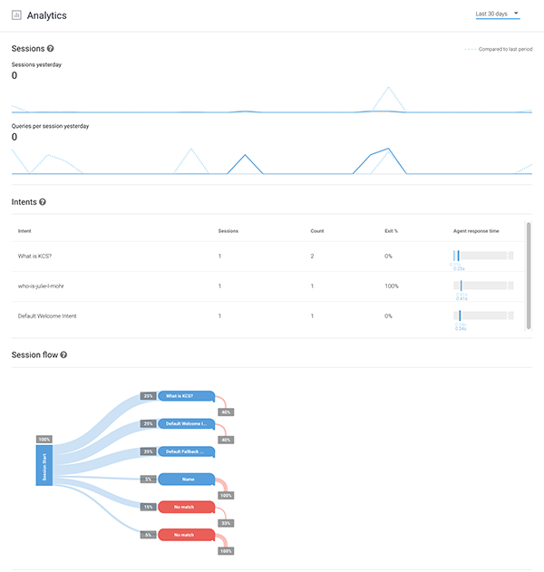 Another part of implementing a chatbot is monitoring the success of Sherlock. Dialogflow provides visibility not only into the number of sessions but also a visualization of how knowledge is being used. The next figure shows the available analytics and the visualization of the knowledge model.