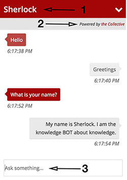 The last decision was the Powered By Text field (3). Essentially this is a small bit of text displayed in the bot that tells the customer the origin of the knowledge. Here I chose to be a complete geek and use "The Collective." Notice that there is HTML code that permits the customer to click on "The Collective." I chose to have this do nothing but saved the settings for later in case I wanted customers to have access to the knowledge base in the future.