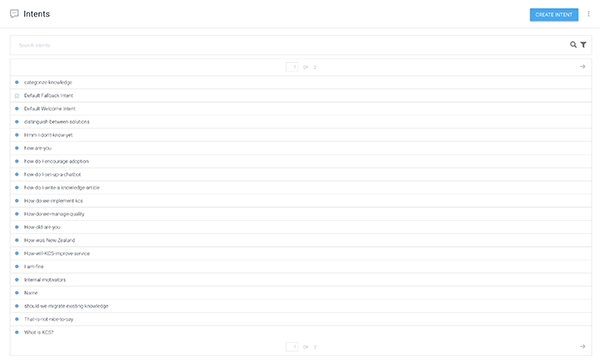 Using the knowledge collected over time, I began adding as many INTENTS as possible, trying not to repeat any questions but instead to add similar questions to one INTENT. The figure below shows the list of INTENTS as more knowledge was entered into the chatbot. It is important to think about a strategy for naming the INTENTS as very quickly it becomes difficult to find the right INTENT to add content to when you have a similar Q&A to add.