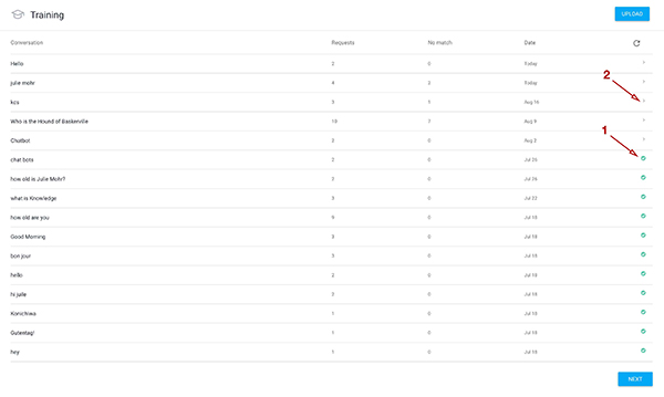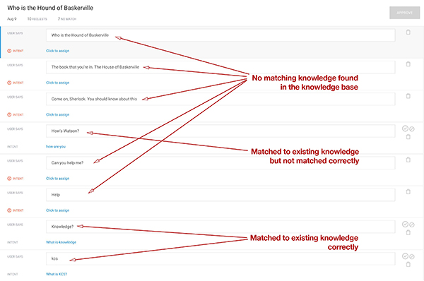 To train Sherlock, I had to open each user’s request and then match each of the individual questions with existing INTENTS or create new INTENTS. The system attempts to match each of the questions with existing INTENTS and sometimes makes mistakes that need to be fixed. In other cases, completely new questions require time to develop a new INTENT. If a question is correctly matched to an existing INTENT and the question is new, it is simply added as a new training phrase to the existing INTENT. While this may sound confusing, training the bot is relatively easy to do but it is time consuming the more the bot is used. The next figure shows the list of training requests that have been added (1) and those that still need to be added (2). Every time I log in to the system, I need to check for new requests in the list.